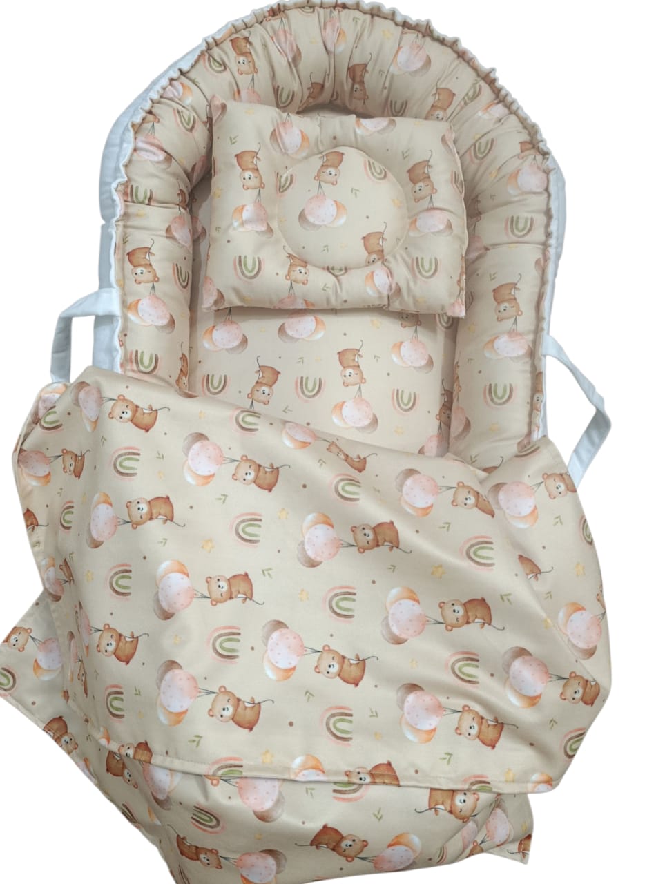 جنس پارچه مخمل خیلی لطیف اصل و مناسب با پوست کودک دارای بالشت حالت دهنده سر نوزاد و پتو مناسب تا دوسالگی تا حدودی قابل تنظیم اندازه تشک دوطرفه میباشد پارچه قابل شستشو می باشد دارای الیاف ضد حساسیت دارای ساک حمل می باشد